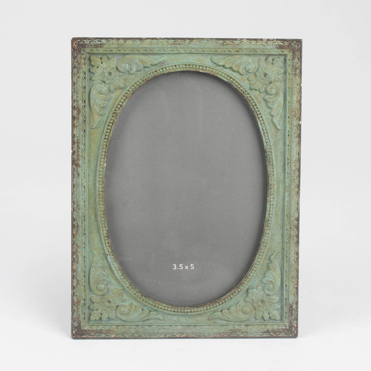 This antique green photo frame brings an elegant vintage charm to your décor. Featuring a classic rectangular shape with a soft oval mount, it beautifully combines traditional styling with a rustic, weathered finish. The ornate floral detailing around the border adds depth and texture, while the aged green patina enhances its old-world appeal. Perfectly sized for 3.5 x 5 inch photos, this frame is ideal for capturing treasured memories. Whether displaying family portraits, travel snapshots, or vintage prints, it makes a beautiful accent on mantels, shelves, or bedside tables. The back includes a secure stand for freestanding use on flat surfaces, adding a timeless focal point to any room.