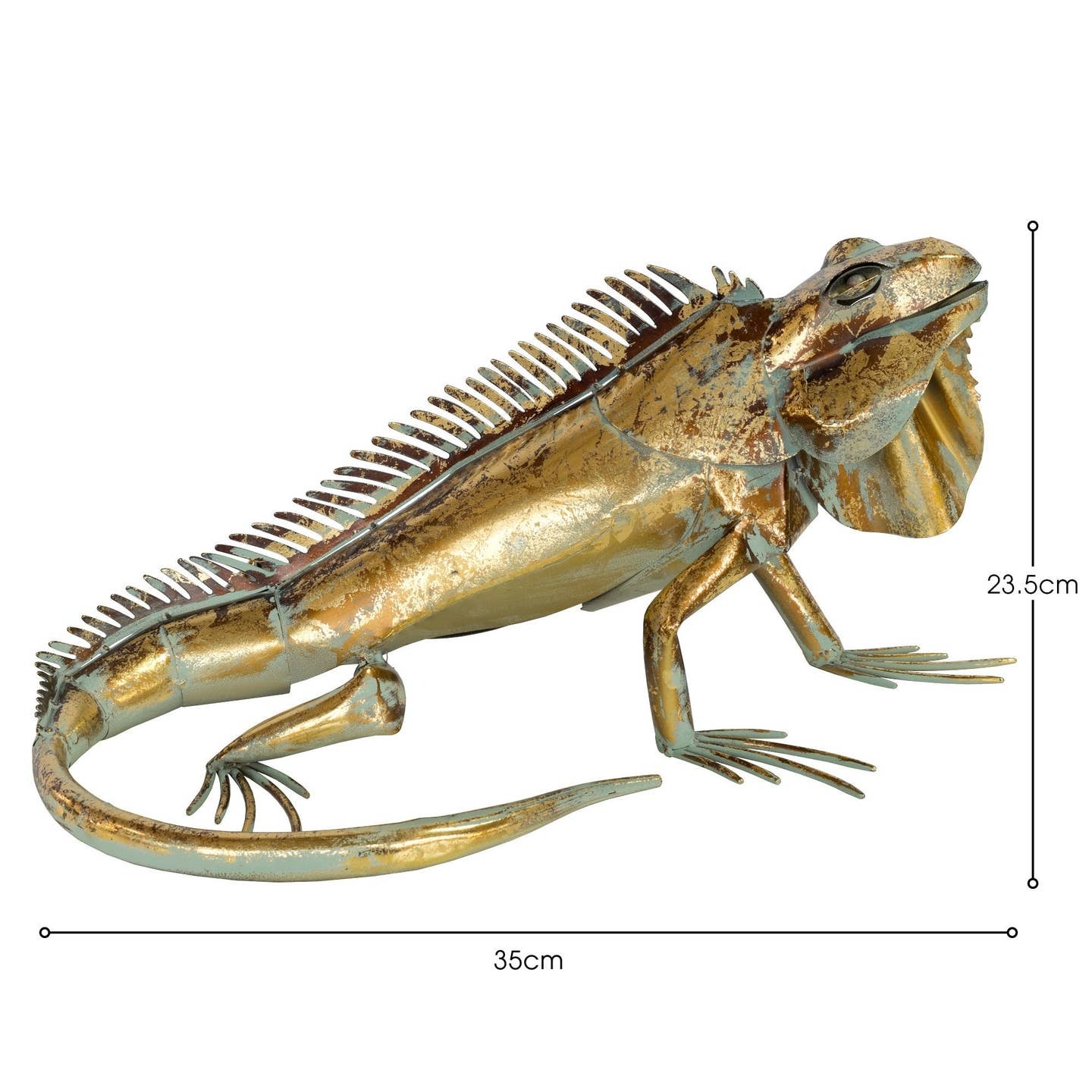 Gold iron iguana metal sculpture home decor lifelike animal ornament Behold the captivating allure of the gold iron iguana, a mesmerizing metal sculpture that transcends the boundaries of artistry. Crafted with precision & passion, this exquisite piece exudes a sense of mystical elegance & timeless charm. Standing proudly upon its sturdy base, the gold iron iguana sculpture comm&s attention with its striking presence. Its sinuous form, meticulously rendered in lustrous golden iron, captures the essence of the majestic reptile with remarkable realism. Every curve & contour of its body is expertly crafted, from the gentle arch of its spine to the delicate ridges of its scales, imbuing the sculpture with a lifelike vitality that is truly captivating.