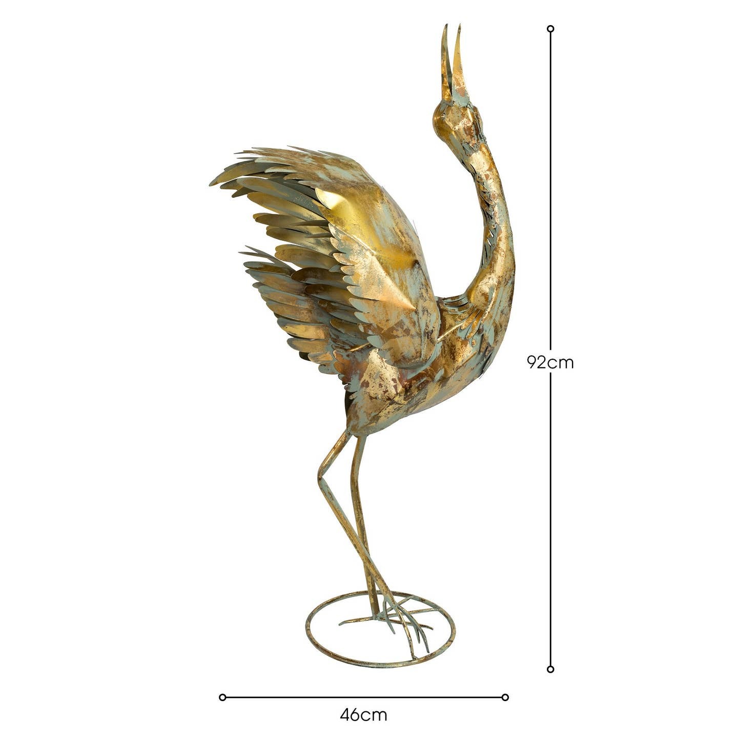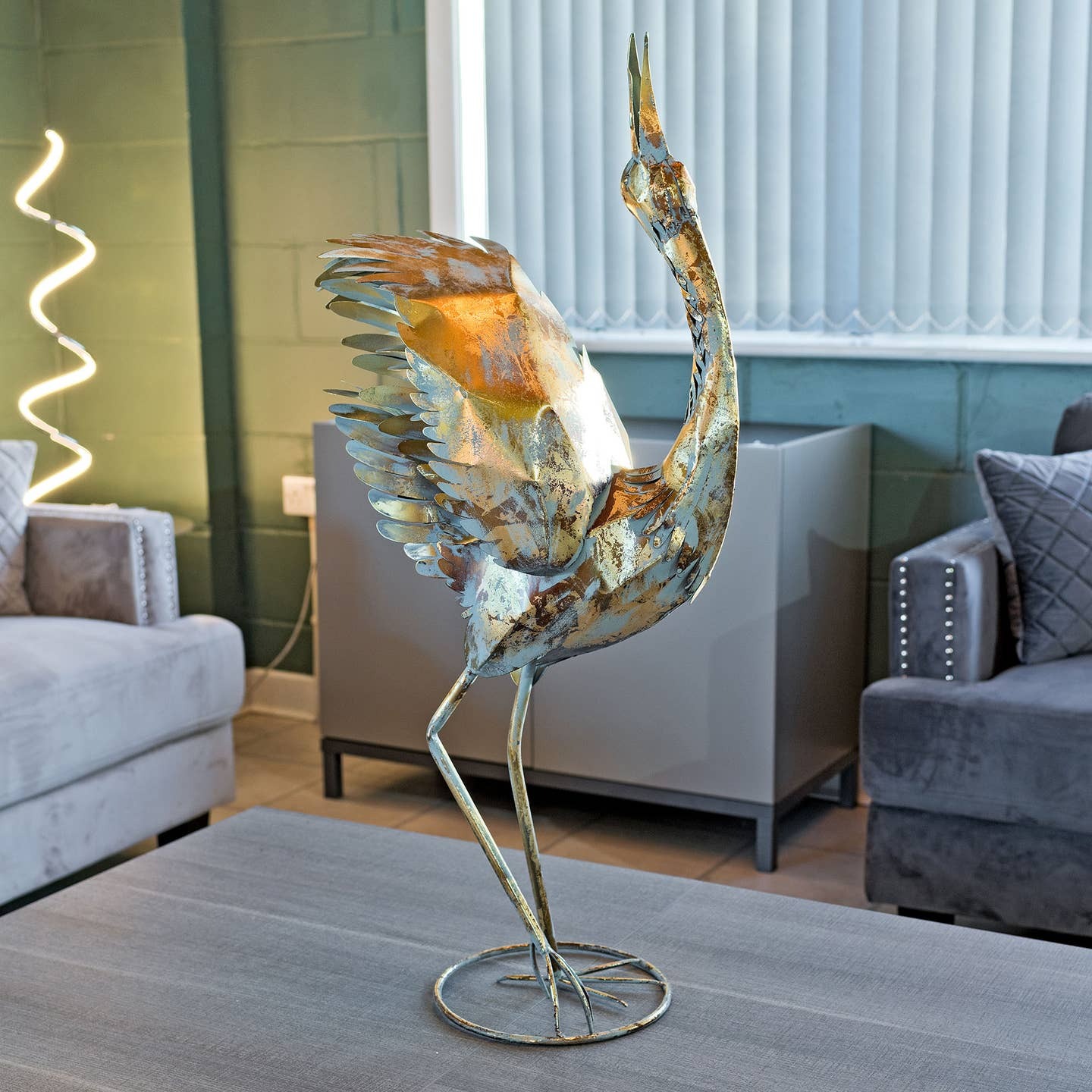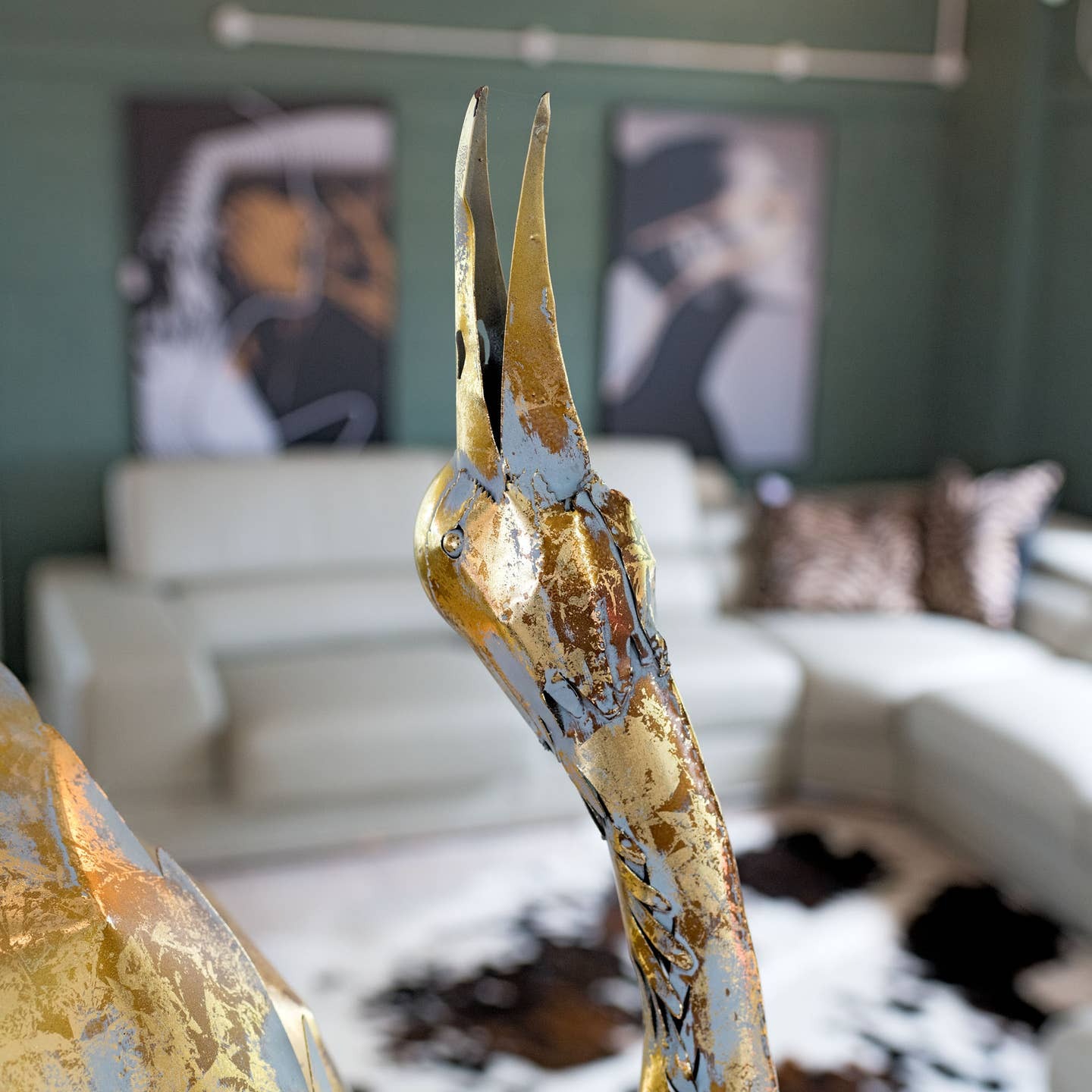 Gold metal iron sitting crane with head up sculpture home decor animal ornament Sitting tall & resplendent, the gold metal iron crane sculpture captures a moment of grace & majesty. Crafted with meticulous attention to detail, its slender form rises from a sturdy base, each feathered contour defined with precision. The crane’s head, held high in a gesture of alertness & elegance, lends an air of noble vigilance to the piece. Cast in radiant gold, the sculpture exudes a timeless allure, shimmering in the light & casting captivating shadows. The subtle interplay of hues & textures adds depth to its presence, inviting admiration from every angle. With its dignified posture & serene expression, the crane embodies qualities of strength, resilience, & poise. This striking sculpture serves as a testament to the beauty of nature & the artistry of human craftsmanship.