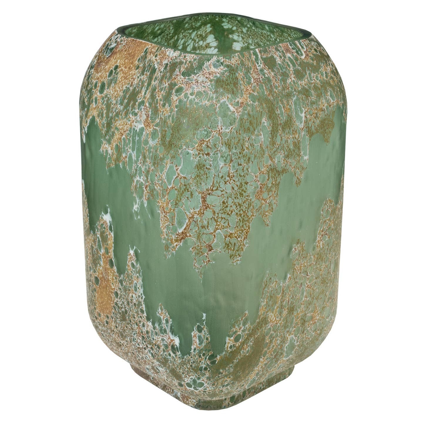 A fabulous tall green and gold rounded rectangular glass planter, this stunning planter vase has a volcanic lava relic look with molten gold features and looks great as a set partnered up with its matching smaller cube planter.