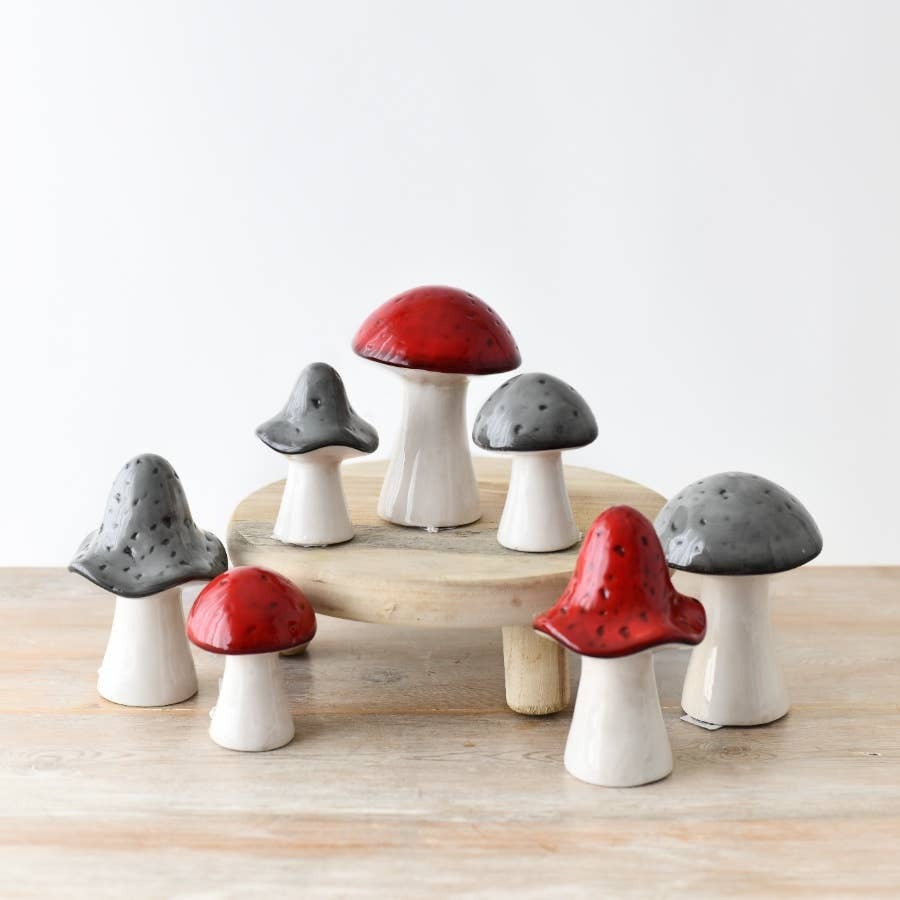 A cute tiny red ceramic mushroom. This glazed and shiny mushroom brings a burst of colour and joy to a room of any style.